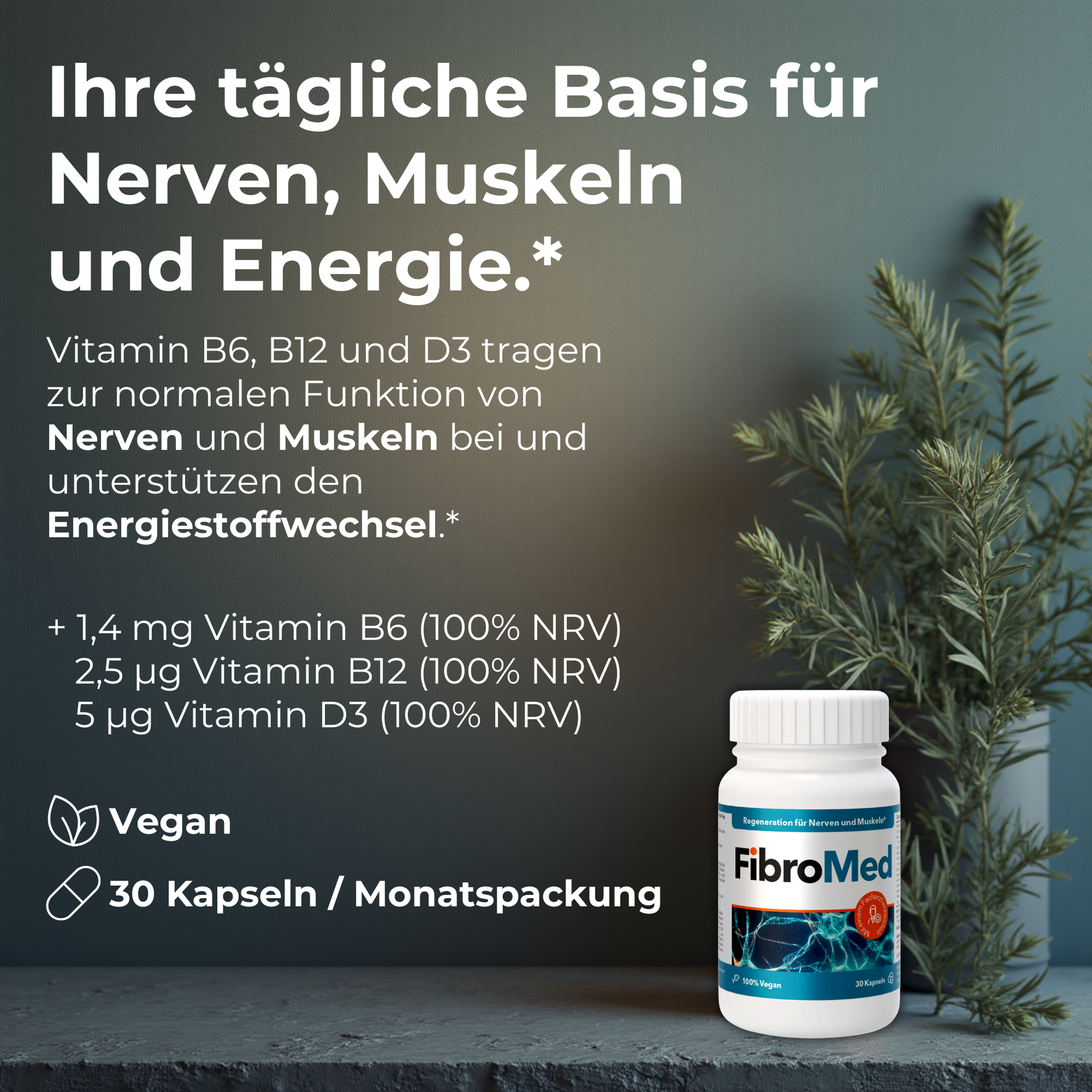 Bei FibroMed® setzen wir uns für eine hochwertige tägliche Mikronährstoffversorgung ein – abgestimmt auf die Bedürfnisse von Menschen ab 40. Unser Nahrungsergänzungsmittel wurde gemeinsam mit einem Facharzt entwickelt und enthält gezielt ausgewählte Mikronährstoffe, darunter Vitamin B6, B12, D3 und Magnesium, die zur normalen Funktion von Nerven, Muskeln und dem Energiestoffwechsel beitragen.* Unser Ziel ist es, durch Qualität, Transparenz und praxisnahe Informationen eine verlässliche Unterstützung im Alltag zu bieten – für alle, die ihrem Körper bewusst etwas Gutes tun möchten.